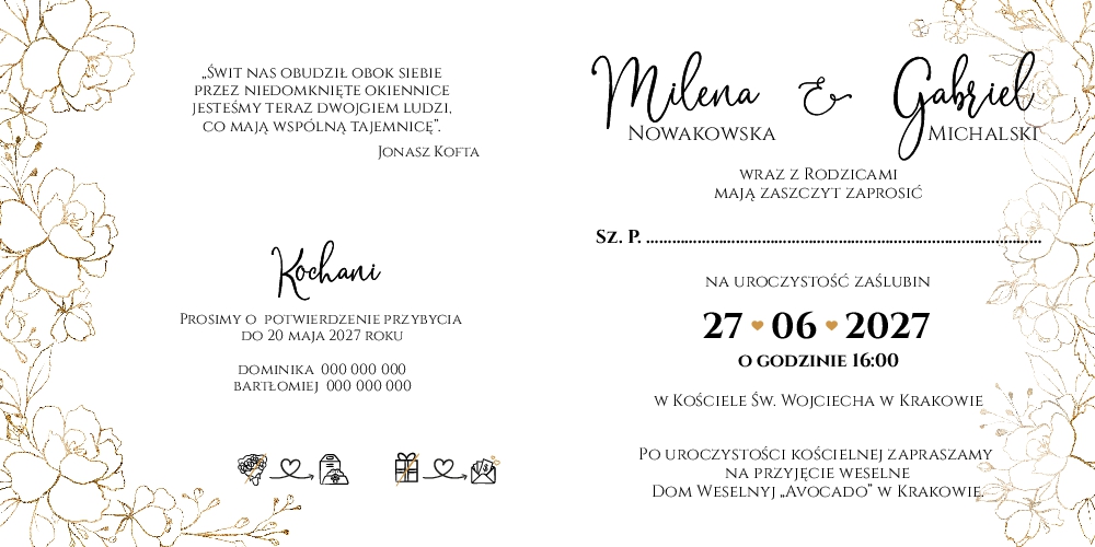 Złocone zaproszenia Ślubne - Ofelia